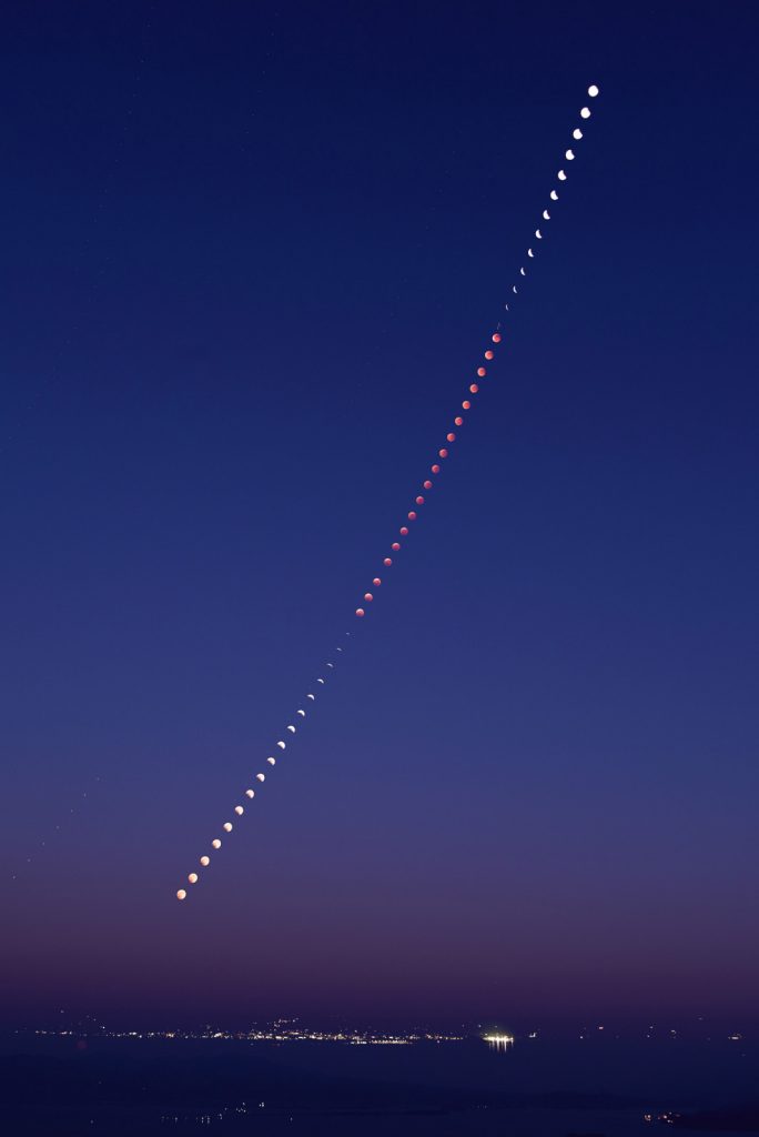 「皆既月食」は太陽・地球・月が一直線に並び、月が地球の影に完全に入る現象です。皆既月食の時は「食の最大」になると月が完全に見えななくなるのではなく、月が真っ赤に見えるのが特徴です。(18:50「欠け始め」 20:34「食の最大」)